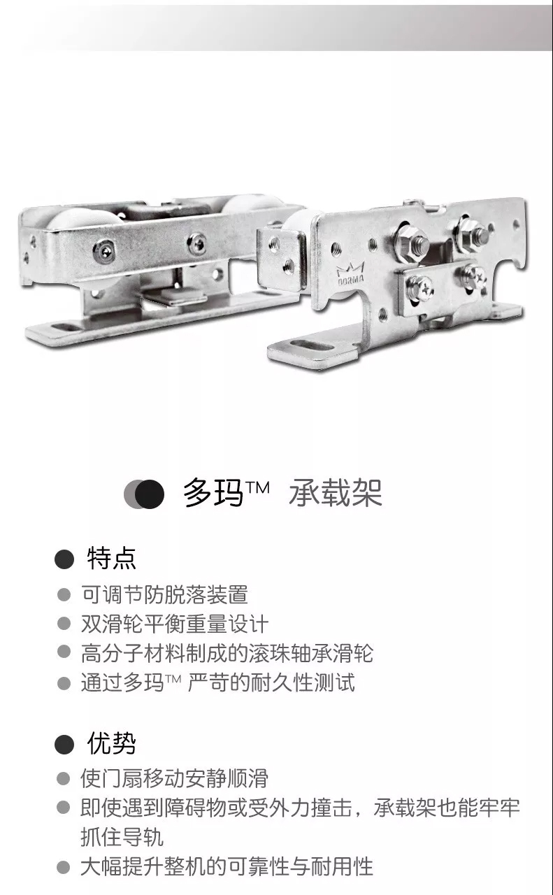 橫置式軌道布局令承載架可從驅(qū)動下方穿過,使軌道長度利用率最大化;且提供整根軌道可選。智能驅(qū)動 輕松無憂,DK90平移門驅(qū)動裝置 即插即用,在啟動時便開始自學(xué)習(xí),根據(jù)實際門寬尺寸自動調(diào)整參數(shù),以達到最佳的運行狀態(tài)。當(dāng)遇到障礙物時,機組將智能地調(diào)整運行模式并在移除障礙物后,自動恢復(fù)正常運行。具有多瑪TM專利的升級卡可提供門機加裝電鎖、后備電池等選配件的擴展功能,用戶可根據(jù)需要選購。
