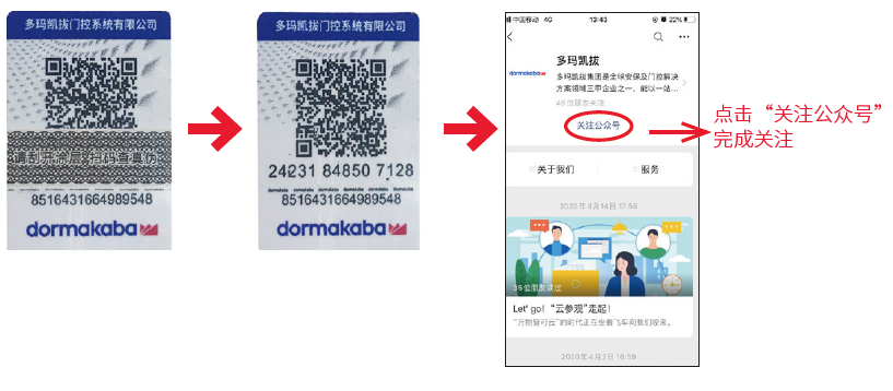 1、刮開地彈簧上的防偽標簽涂層所示的防偽碼,掃描二維碼并關注多瑪凱拔微信公眾號。